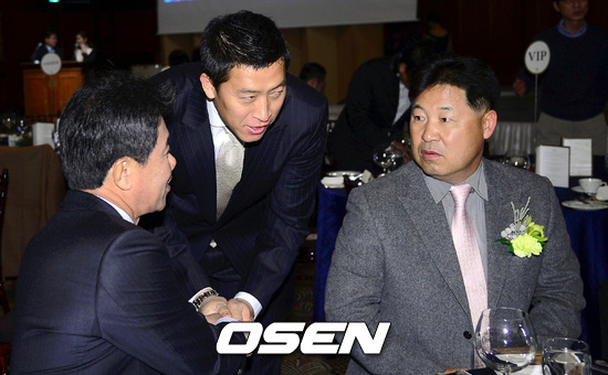 7일 오후 서울 강남구 논현동 임피리얼 팰리스 호텔에서 열린 '2012프로야구 스포츠토토 올해의 상' 시상식에서 LG 이병규가 롯데 김시진, SK 이만수 감독과 인사를 나누고 있다.