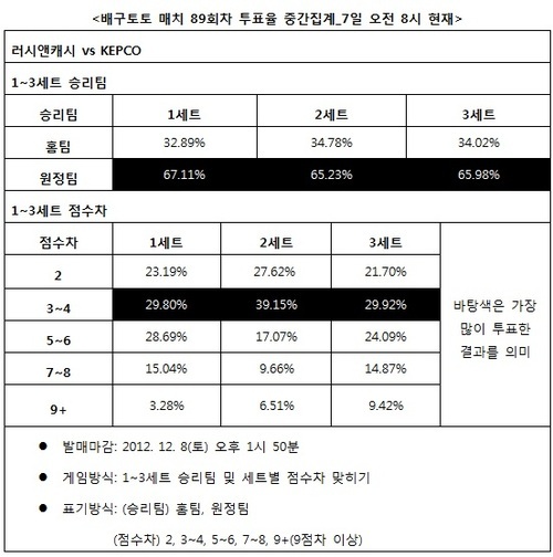 [배구토토] 국민체육진흥공단(www.kspo.or.kr)이 발행하는 체육진흥투표권 수탁사업자인 스포츠토토 공식 온라인 발매사이트 베트맨(www.betman.co.kr)이 오는 8일 오후 7시 아산이순신실내체육관에서 열리는 2012-2013 V리그 러시앤캐시-KEPCO전 대상 배구토토 매치 89회차 게임 투표율을 중간집계한 결과, 국내 배구팬들은 KEPCO의 우세를 내다봤다고 전했다.