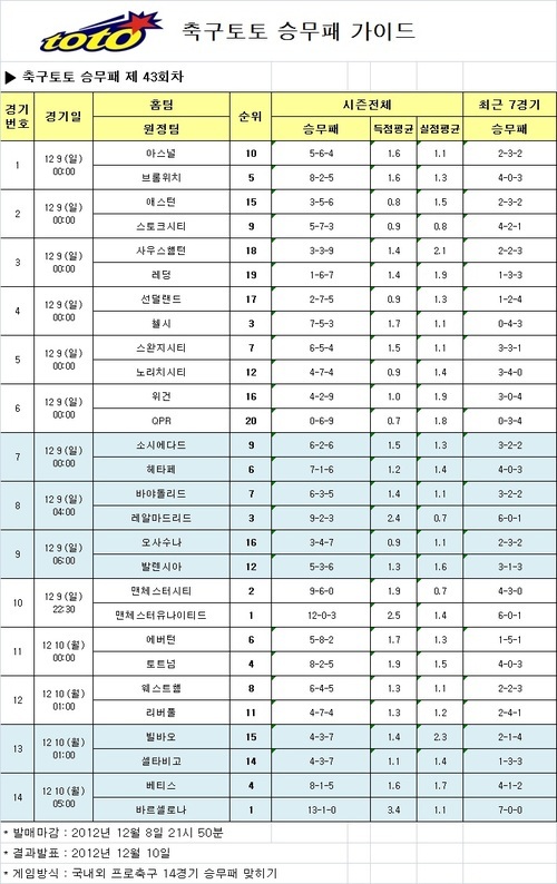 [축구토토] 국민체육진흥공단(www.kspo.or.kr)이 발행하는 체육진흥투표권 수탁사업자인 스포츠토토 온라인 공식 발매사이트 베트맨(www.betman.co.kr)은 오는 9일부터 이틀간 열리는 잉글랜드 프리미어리그(EPL) 9경기와 스페인 프리메라리가 5경기 등 총 14경기를 대상으로 한 축구토토 승무패 43회차 투표율 중간집계 결과, 맨체스터시티-맨체스터유나이티드(10경기)전에서 국내 축구팬 들은 양 팀이 치열한 승부를 펼칠 것으로 예상했다고 밝혔다.
