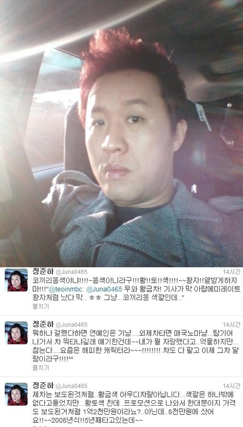 정준하는 지난 7일 오후 자신의 트위터에 “제 차는 보도된 것처럼 황금색 아우디 차량 아닙니다. 색깔은 하나밖에 없다고 들었지만 황토색 찬데 프로모션으로 나와서 한 대뿐이지 가격도 보도된 거처럼 1억 2천만 원이라뇨? 아닌데 8천만 원에 샀어요. 2008년식 5년째타고있는데”라는 글을 게재했다.