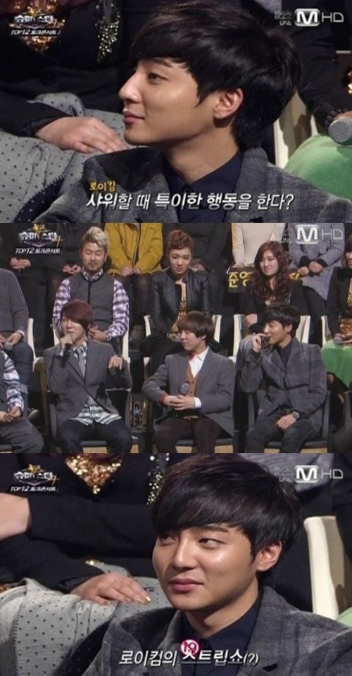 김태현은 지난 7일 오후 방송된 엠넷 ‘슈퍼스타K4 TOP12 토크콘서트’에서 “아침마다 운동을 하고 같이 샤워를 했다. 로이킴이 미국에서 살다 와 좀 자유분방한 스타일이라 그런지 스트립쇼를 하더라”며 로이킴의 독특한 샤워 습관을 깜짝 공개했다.