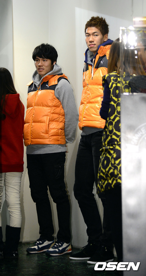 8일 오후 서울 중구 명동 푸마매장에서 열린 '홍명보 자선축구경기 10주년 기념 사인회'에 참석한부산 아이파크 김창수, 이범영이 사인회 시작을 기다리고 있다.