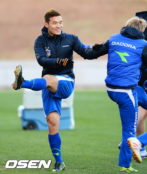 울산 김승용이 이근호와 함께 미나토 사커필드에서 훈련을 하며 환하게 웃고 있다.