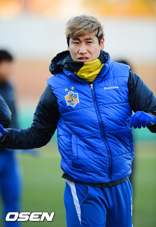 울산 이근호가 미나토 사커필드에서 몸을 풀며 얼굴을 찡그리고 있다.