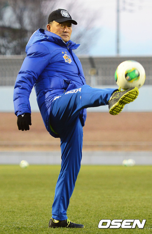 울산 김호곤 감독이 미나토 사커필드에서 훈련 중 공인구 카푸사로 묘기를 보여주고 있다.
