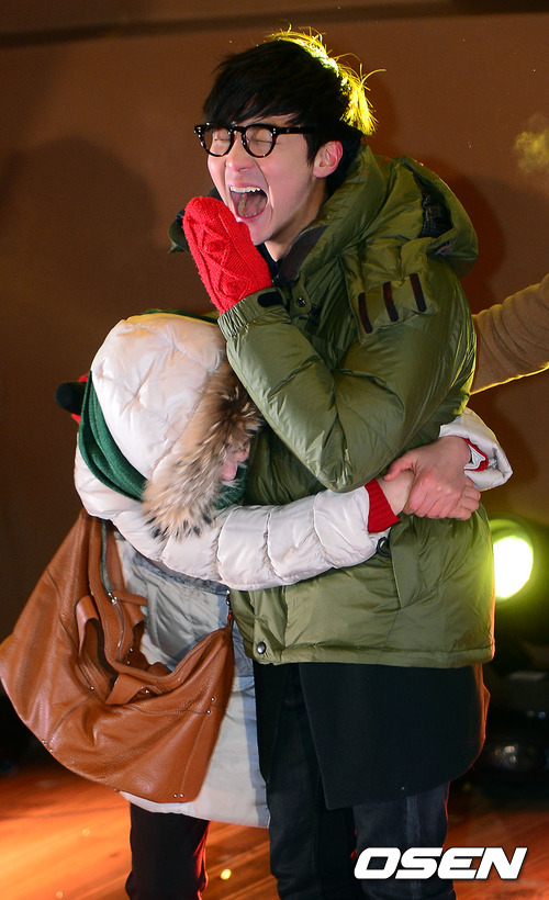 8일 오후 서울 마포구 서교동에 위치한 메세나폴리스 야외 공연장에서 Mnet '슈퍼스타K4' 우승자 로이킴이 막걸리 게릴라 콘서트를 열어 여성팬과 포옹을 하고 있다.