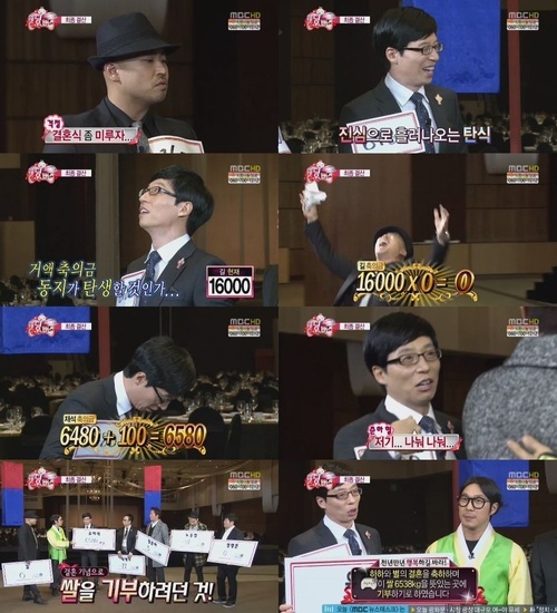 유재석은 6480만원에서 '+100'이 나와 총 6580만원이라는 거액의 축의금을 내야했다.