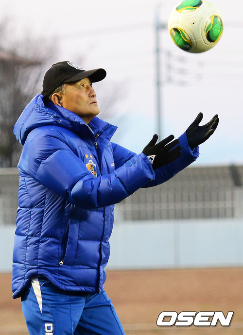 울산 김호곤 감독이 미나토 사커필드에서 훈련 중 공인구 카푸사를 던져보고 있다.