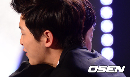 최우수 남자 연기상을 수상한 송중기가 대상을 수상한 손현주를 축하해주고 있다.