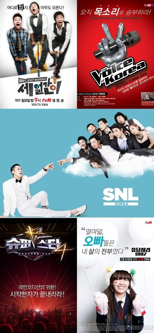 지겹다, 지겹다해도 리모컨이 멈추는 건 오디션 프로그램이었다. 이번에 케이블에서 선보인 오디션 또는 서바이벌 형식의 예능 프로그램은 줄잡아 7개 남짓. ‘마스터셰프코리아’, ‘쇼미더머니’, ‘보이스코리아’, ‘슈퍼스타K 4’, ‘슈퍼디바 2012’, ‘도전 슈퍼모델코리아’, ‘프로젝트 런웨이’ 등이다. 넘쳐나는 오디션 프로그램에 질린다는 말이 나오지만 그래도 성적표는 나쁘지 않았다. 성공의 잣대인 시청률 1%를 모두 넘어섰으며 ‘마스터셰프 코리아’는 마니아 층의 지지 속에 최고 2.6%를 돌파했다. ‘보이스 코리아’는 조명 받지 못한 실력파 가수들을 양지로 끌어냈으며 ‘도전 슈퍼모델코리아’, ‘프로젝트 런웨이’는 참가자들의 갈등을 막장스럽게 다루며 시선몰이에 성공했다. 특히 ‘슈퍼스타K’의 경우 전 시즌들에 비해 파급력이 약하다는 우려의 목소리를 들었으나 동시간대 방영된 MBC ‘위대한 탄생3’, SBS ‘고쇼’와의 시청률 경쟁에서는 우위를 차지했다.