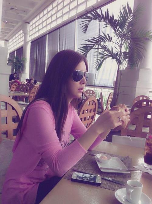 사진 속 한채아는 분홍색의 편한 의상을 입고 눈에는 선글라스를 착용한 채 이국적 분위기가 돋보이는 식당에 앉아 있다.