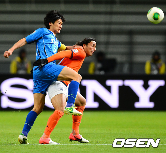 후반 울산 곽태휘가 몬테레이의 알도 데 니그리스에게 막히고 있다.
