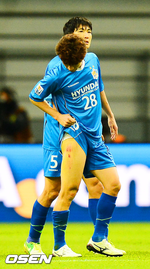 경기를 마치고 울산 김치곤이 경기 중 다친 상처를 살피고 있다.