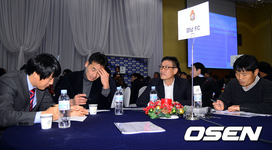 10일 오전 서울 홍은동 그랜드힐튼호텔에서 진행된 '2013년 K리그 신인선수 선발 드래프트'에서 경남 FC 최진한 감독과 구단 관계자들이 신인선수 선발을 위해 자료를 꼼꼼하게 확인하고 있다.
