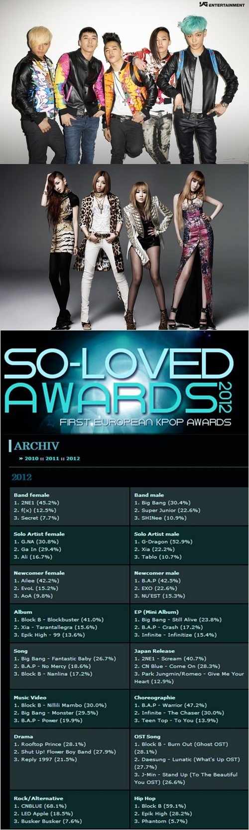 그룹 빅뱅과 2NE1이 2012 유럽피안 K팝 어워드 '소-러브드 어워드'에서 각각 남,녀 그룹 다관왕을 차지해 글로벌한 인기를 입증했다.