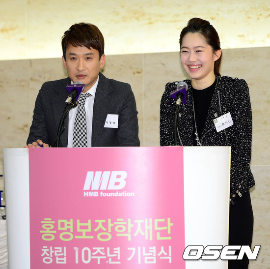 10일 오전 서울 서초구 반포동 팔래스호텔에서 열린 '홍명보장학재단 창립 10주년 기념식'에서 방송인 서경석과 엄지인 아나운서가 행사를 진행하고 있다.