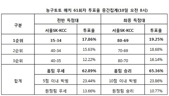 KCC의 승리를 예상한 참가자는 10.77%로 집계됐고, 양 팀 10점 이내 박빙 승부를 예상한 참가자는 23.86%로 나타났다.