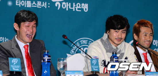 10일 오후 서울 서초구 반포동 팔래스호텔에서 열린 '하나은행과 함께하는 Share the Dream Football Match 2012' 미디어데이에서 안정환 홍보팀장의 말에 최용수 감독이 환하게 웃고 있다.
