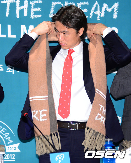 10일 오후 서울 서초구 반포동 팔래스호텔에서 열린 '하나은행과 함께하는 Share the Dream Football Match 2012' 미디어데이에서 홍명보 감독이 기념촬영에 앞서 목도리를 착용하고 있다.
