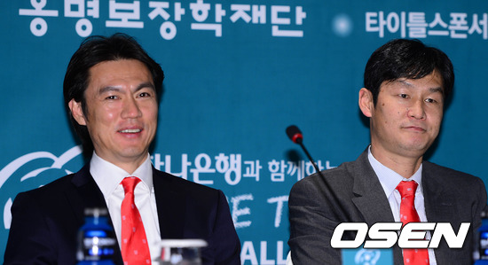 10일 오후 서울 서초구 반포동 팔래스호텔에서 열린 '하나은행과 함께하는 Share the Dream Football Match 2012' 미디어데이에서 홍명보 감독과 FC 서울 최용수 감독이 환하게 웃고 있다.