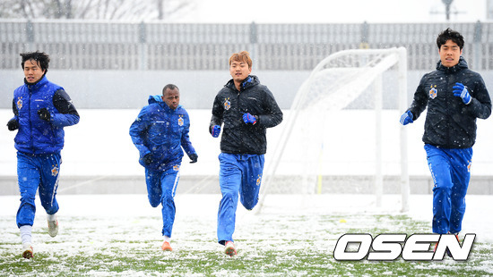 울산 선수들이 눈보라 속 회복 훈련을 하고 있다.