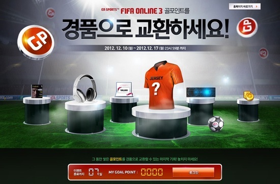 ‘골 포인트’란 ‘FIFA 온라인 3’의 홈페이지 내 활동 내용에 따라 누적되는 포인트로, 이벤트 기간 동안 선착순으로 헤드폰, 기계식 키보드, 스완지시티 기성용 친필 사인 유니폼 및 축구공, 조이패드, 각종 기프트콘 등 총 24종에 달하는 상품으로 교환할 수 있다.
