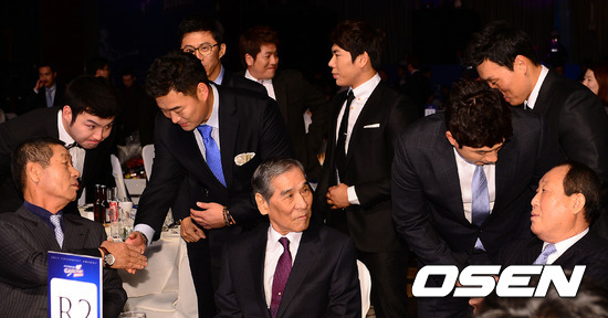 시상식에 참석한 선수들이 레전드상을 수상한 김성근, 김영덕, 김인식 감독에게 인사를 하고 있다.