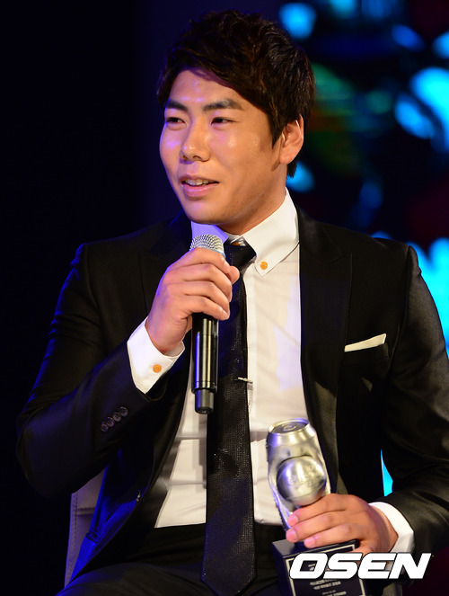 타자부문 TOP3에 선정된 넥센 강정호가 인터뷰를 하고 있다. 강정호는 지난 10월 4일 한화 류현진의 10승 도전 경기서 홈런을 날려 7년 연속 10승 달성을 무산시킨 바 있다.