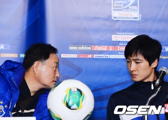 11일 오후 일본 나고야에 위치한 매리어트 호텔서 열린 ‘국제축구연맹(FIFA) 클럽월드컵 재팬 2012’ 산프레체 히로시마와의 5-6위 결정전 기자회견서 울산 김호곤 감독과 곽태휘가 얘기를 나누고 있다.