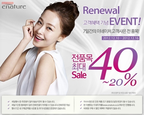 한불화장품의 스마트 코스메틱 브랜드 이네이처가 런칭 1주년을 맞아 온라인 자사 쇼핑몰을 리뉴얼하고 2012년 결산 세일을 실시한다.