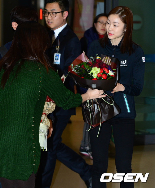 김연아가 여성팬에게 꽃다발을 받고 있다.