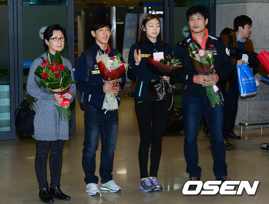 신혜숙 코치, 김진서, 김연아, 류종현 코치가 취재진을 향해 인사를 하고 있다.