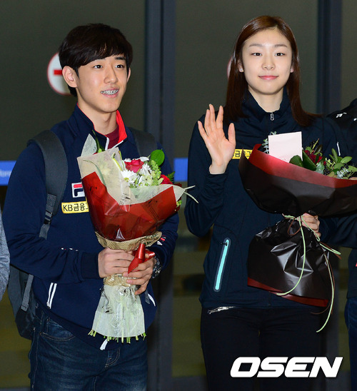 김진서와 김연아가 취재진을 향해 포즈를 취하고 있다.
