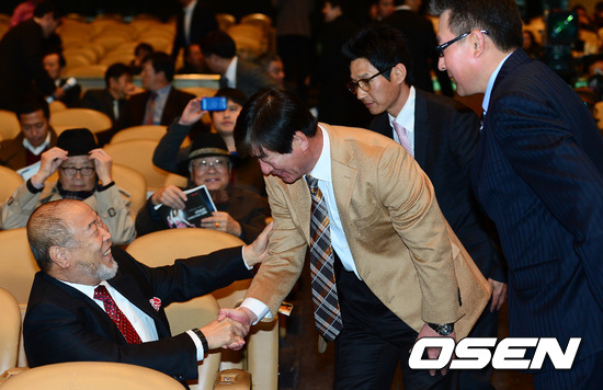 시상식에 앞서 백인천 감독이 삼성 류중일 감독과 인사를 나누고 있다.
