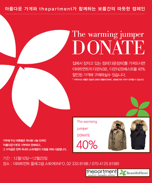 집에서 사용하지 않는 겨울 점퍼를 서울 홍대 근방에 있는 더파트먼트(thepartment) 플래그십 스토어로 가져오면 더파트먼트(thepartment)의 다운재킷N3B와 다운 베스트 N2B제품을 40% 할인된 가격에 구매할 수 있다.