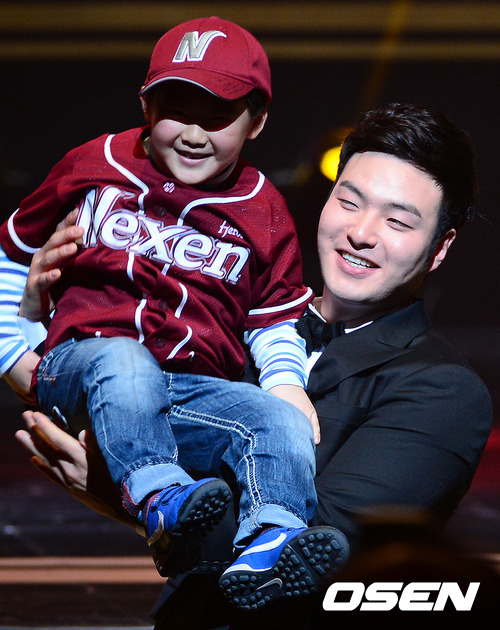 개그맨 변기수의 사회로 진행된 식전행사에서 넥센 박병호가 어린이 야구팬과 사진 촬영을 하고 있다.