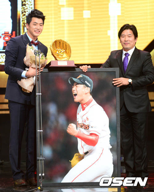 골든포토상을 수상한 SK 김광현이 강영조 한국스포츠사진기자회장과 포토타임을 하고 있다.