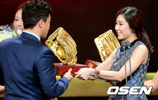외야수 부문 골든글러브상을 수상한 롯데 손아섭이 최희 아나운서에게 골든글러브를 받고 있다.