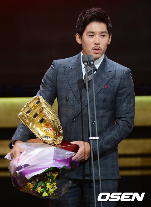 이용규는 “사실 올해는 기대를 안 하고 참석했다. 이름이 불릴 줄은 생각을 못했다. 확실히 개인 타이틀이 좋은 것 같다. 맹장수술 후에 최대한 빨리 복귀한 것이 잘했던 것 같다”라고 미소지었다. “10구단 창단 승인이 돼서 기억에 남는 하루일 것 같다”라고 한 이용규는 “가족, 부모님 못지않게 팬이 되주신 장인, 장모님, 정성스럽게 밥상을 차려주는 유하나 여신께 감사한다”라고 소감을 밝혔다.