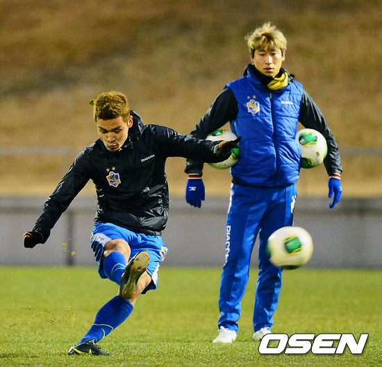훈련 중 울산 김승용이 이근호 앞에서 슈팅훈련을 하고 있다.