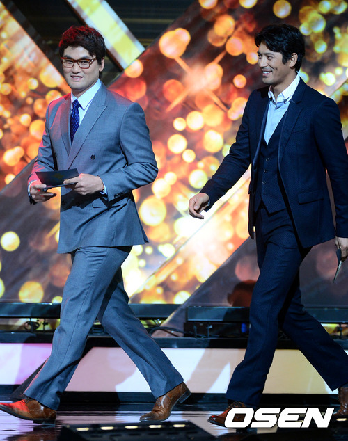 박찬호와 배우 오지호가 투수 부문 골든글러브를 시상하기 위해 무대에 들어서고 있다.
