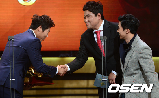 유격수 부문 골든글러브를 수상한 넥센 강정호가 양준혁, 허경환의 축하를 받고 있다.