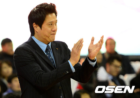 11일 오후 서울 잠실학생체육관에서 열린 'KB 국민카드 2012-2013 프로농구' 서울 SK와 전주 KCC의 경기, 3쿼터 SK 문경은 감독이 선수들에게 박수를 보내고 있다.
