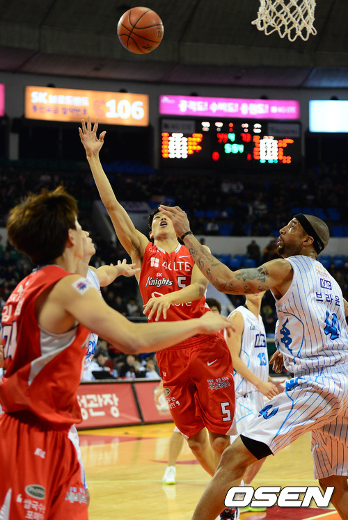 11일 오후 서울 잠실학생체육관에서 열린 'KB 국민카드 2012-2013 프로농구' 서울 SK와 전주 KCC의 경기, 4쿼터 SK 김선형이 KCC 수비진을 돌파 후 레이업슛을 시도하고 있다.