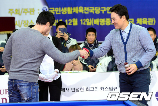 12일 오전 서울 송파구 삼전동 배명고등학교 체육관에서 진행된 제1회 지마이다스배 '2012 프로야구선수 3쿠션대회'에서 이승엽과 조성환이 악수를 나누고 있다.