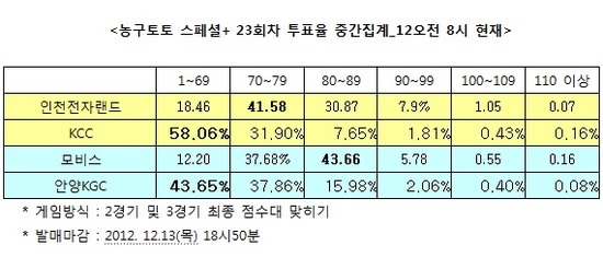 [농구토토] 국민체육진흥공단(www.kspo.or.kr)이 발행하는 체육진흥투표권 수탁사업자인 스포츠토토 공식 온라인 발매 사이트인 베트맨(www.betman.co.kr)은 오는 13일에 펼쳐지는 인천전자랜드-KCC(1경기), 모비스-KGC(2경기)전 등 한국프로농구(KBL) 2경기를 대상으로 한 농구토토 스페셜+ 23회차 투표율 중간집계 결과, 참가자들은 2경기 모비스-KGC전에서 홈팀 모비스의 완승을 전망했다고 전했다.