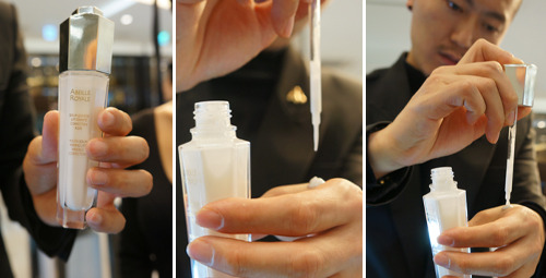 “20대 중반에서 30대 초반으로 간다면 주름과 탄력에 신경 써야 합니다. 추천하는 제품은 프랑스 청정구역에서 사는 흑벌의 로열젤리로 만든 ‘아베이 로얄 유스 세럼’입니다. 흑벌 꿀 에센스라고도 불리죠. 30대 중후반 이상이라면 피부재생에 도움이 되는 ‘오키드 라인’을 추천합니다. 오키드가 장수식물로 분류된 서양난을 뜻하는데요. 다시 어린피부로 되돌리는 효능이 있죠.”