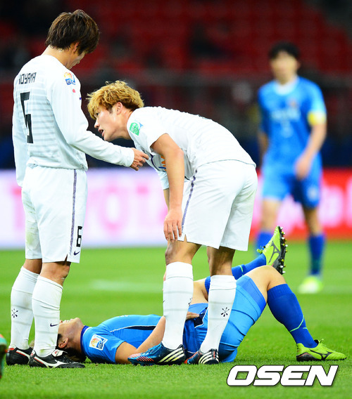 후반 울산 이근호가 히로시마 황석호의 태클에 걸려 넘어진 후 고통을 호소하자 황석호가 이근호를 걱정하고 있다. / rumi@osen.co.kr