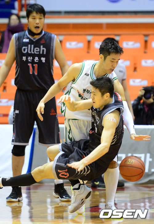 12일 오후 부산 사직체육관에서 열린 'KB 국민카드 2012-2013 프로농구' 부산 KT와 원주 동부의 경기 2쿼터 KT 조성민과 동부 이광재가 충돌하고 있다.