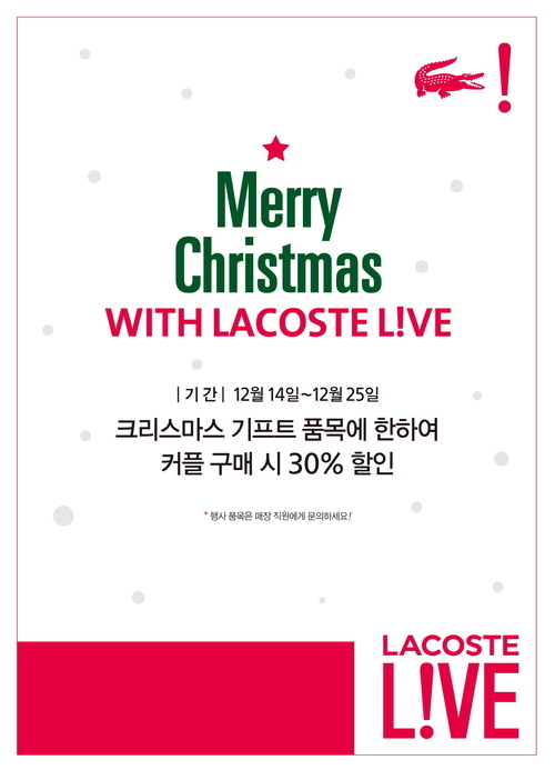 이번 ‘Merry Christmas with LACOSTE L!VE’ 프로모션은 라코스테 라이브가 준비한 크리스마스 기프트 아이템 중, 커플 구매시 해당 아이템을 30% 할인해주는 이벤트이다. 14일부터 크리스마스인 25일까지 진행된다.